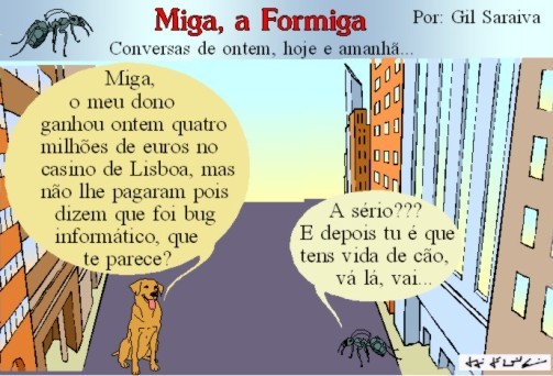 Sátiras à atualidade portuguesa (e alguma internacional), nas áreas política, de sociedade e desportiva através do Humor gilcartoon com Miga, a Formiga, nos seus eternos diálogos com outros personagens...