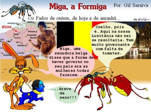 Sátiras à atualidade portuguesa (e alguma internacional), nas áreas política, de sociedade e desportiva através do Humor gilcartoon com Miga, a Formiga, nos seus eternos diálogos com outros personagens...